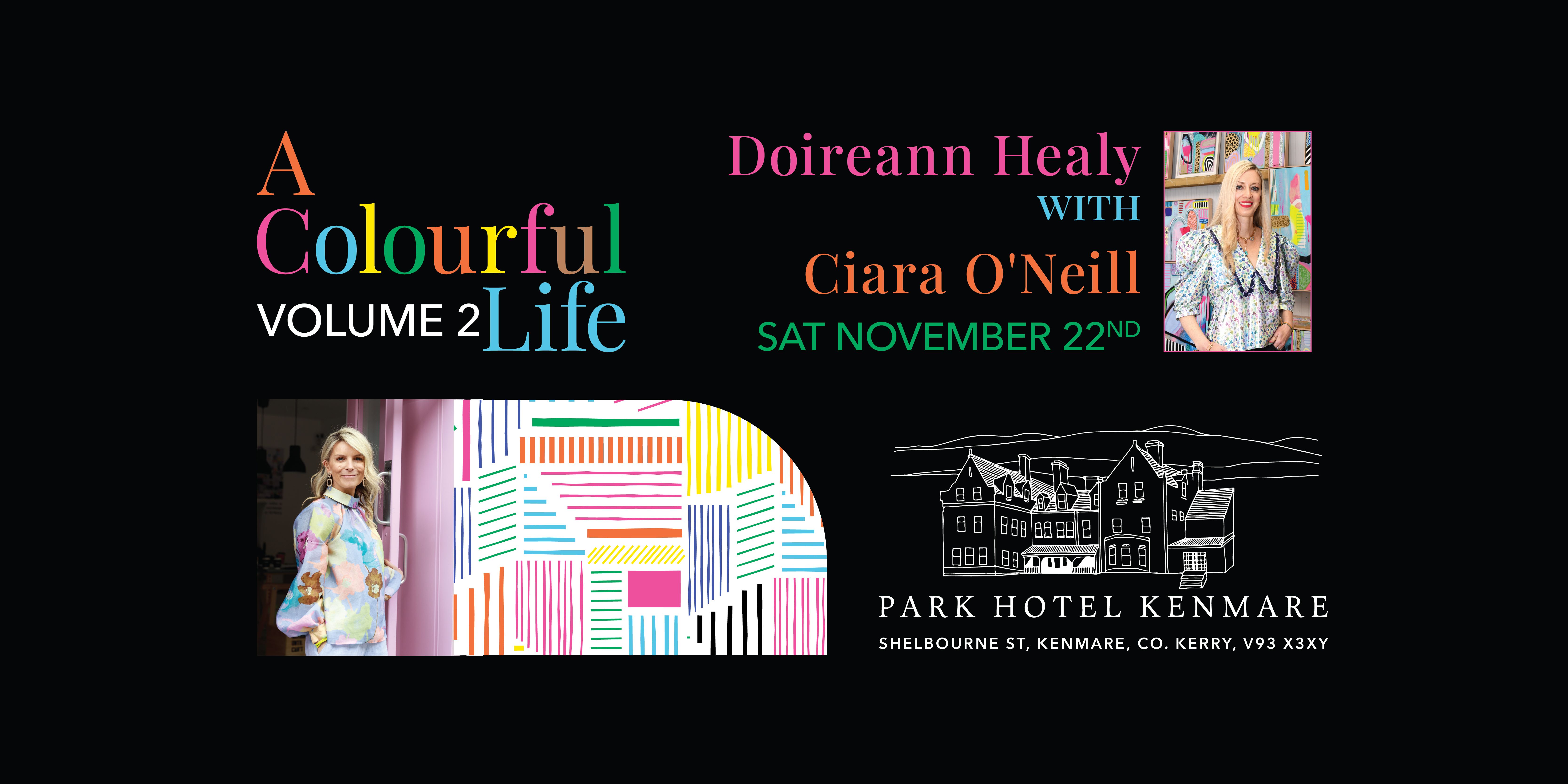 Join us on Saturday November 22nd as Doireann will be joined by celebrated contemporary artist Ciara O’Neill to chat about all things colour and life over champagne at the Park Hotel Kenmare.